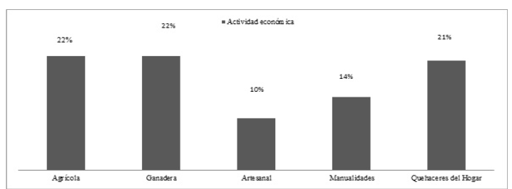Entre las actividades económicas de los socios están la agricultura (siembra de quinua) y la ganadera con un 22%, seguido por los quehaceres del hogar con un 21%, luego las manualidades al 14%, y actividades artesanales en un 10%, lo que evidencia que los créditos concedidos, esta destinados a inversiones en las 2 principales actividades presentadas en la figura 1.