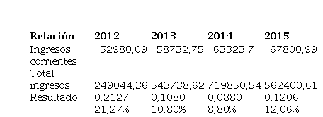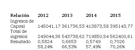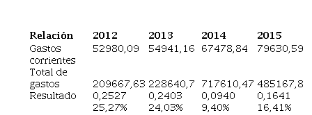 En el año 2015 existió un aumento del 7.01% con relación a los gastos corrientes por lo que tuvo un déficit corriente de $7620,88, considerando que los gastos corrientes ayudan al logro de objetivos y metas se puede denotar que en estos años existe una relación directa entre los ingresos y los gastos, valores que ayudan a fortalecer el desarrollo de las actividades. Romero (2014) menciona que los gastos corrientes retribuyen mediante ingresos a servidores públicos y delegan recursos con carácter social.
