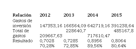 Los gastos de inversión en el año 2012 representan un 70,28%, en el año 2013 aumentó en un 2,57%, mientras que para el año 2014 incrementa de manera considerable un 16,71% y en el año 2015 decae en con un 8,92%.