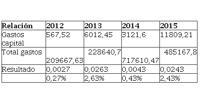 En el GAD parroquial rural de Bachillero los gastos de capital en el año 2012 son de 0,27%, en el año 2013 incrementan notoriamente con un 2,36%, mientras que para el año 2014 decae el 2,20% y para el año 2015 aumenta un 2%.