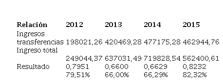 El GAD parroquial rural de Bachillero en el año 2012 dependió del gobierno central en un 79,51%, en el año 2013 disminuye en un 13,51% debido a que en la cuenta saldos disponibles de este año existe un valor de $ 93292,87 que, comparado con el del 2012 es de $ 0; en el año 2014 aumenta en un 0,29% en relación al año anterior por lo que se tuvo ingresos mayores en la cuenta de rentas e inversiones y multas, así mismo para el año 2015 tiene un aumento del 16,03%.