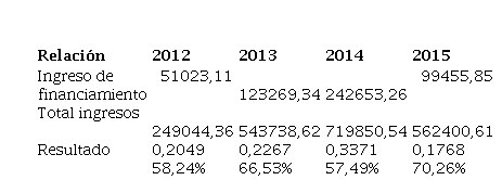 De acuerdo a los ingresos de financiamiento presentados en el cuadro n. 7, se observa que ha existido un incremento en los diferentes años, lo que significa que el GAD ha incurrido en un aumento de sus obligaciones. Como lo ilustra León et al. (2012) constituyen fuentes adicionales de recursos obtenidos por el estado, a través de la captación del ahorro interno y externo, esto produce en forma contable modificaciones
