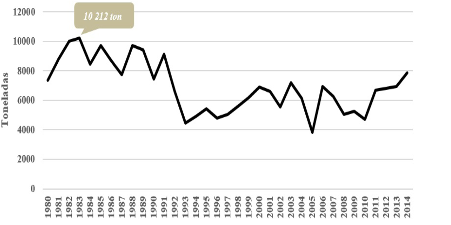 Figura 3: Evolución de la producción de miel en Cuba (1980-2014)