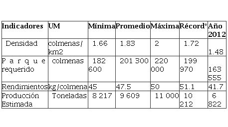 Una proyección de los escenarios que resultan de combinar: el parque de colmenas (actual, requerido mínimo, máximo y promedio y el correspondiente al récord histórico) con el rendimiento por colmena (actual, potencial mínimo, máximo y promedio); permitió constatar que, con el parque de colmenas disponibles en la actualidad, no es posible rebasar las 8217 toneladas, ni siquiera logrando el rendimiento máximo (ver Anexo 2).