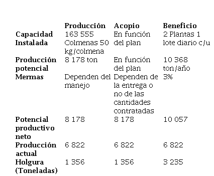 Los niveles de producción potencial más realistas, estimados a través de este análisis, oscilan entre 9000 y 10 000 toneladas: Son bastante creíbles considerando el techo productivo alcanzado de 10212 toneladas en el año 1983. Precisamente en este rango se mueve hoy el Programa de Desarrollo del Sector Apícola. La capacidad potencial de acopio depende de la forma en que manejen sus inventarios y flujos logísticos. En la práctica, el plan de producción se hace coincidir con dicha capacidad. Cuando el desempeño de la logística y el manejo de inventarios permiten acopiar un poco más y a la vez los productores tienen un buen desempeño, ello se traduce en un sobre cumplimiento del plan.