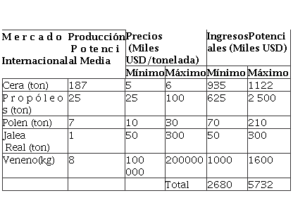 En función del número de colmenas que garantiza la capacidad potencial promedio, se puede constatar que, con el déficit de colmenas anual en los últimos cinco años, los rendimientos que se obtuvieron en esos años y los precios de exportación correspondientes, el valor potencial perdido fue como promedio de 4 116 000 USD cada año.