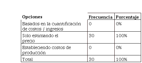 De los Socios encuestados, 30 mencionaron que para el cálculo de la utilidad sobre los productos de su negocio lo hacen solo estimando el precio, lo que representa el 100% de la población. Al no definir una utilidad del cálculo general de los costos, no existe una justa retribución de los costos incurridos, por lo tanto, la Asociación no genera lo suficiente y no mantiene precios estándares tal como lo asevera la competencia.