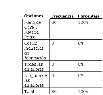 De acuerdo a la encuesta realizada, 30 mencionaron que para la determinación del precio toman en cuenta la materia prima y la mano de obra directa, lo que representa el 100% de la población. Al solo calcular materia prima y mano de obra, se estaría dejando a un lado aquellos costos indirectos que son necesarios en la elaboración de los dulces, por lo tanto, la estimación del precio no es real y se recurre a la perdida y falta de valoración del negocio.