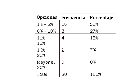 De los Socios encuestados, 16 mencionaron que el porcentaje promedio de utilidad le genera o tiene sobre los ingresos por las ventas de los dulces y los costos de producción está entre el 1- 5%, lo que representa el 53% del total de la población, mientras que 8 de ellos respondieron que el porcentaje promedio de utilidad esta entre el 6- 10%, así también 4 de ellos dijeron que el porcentaje promedio es del 11- 15%, lo que equivale al 13%; y 2 de ellos respondieron que el porcentaje promedio de utilidad le genera o tiene sobre los ingresos por las ventas es de entre el 16- 20%, lo que representa el 7% de la población