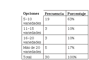 De los Socios encuestados, 19 mencionaron que elaboran de 5 a 10 variedades de dulce, lo que representa el 63% del total de la población, mientras que 3 de ellos respondieron que realizan de 1115 y de 16- 20 variedades de dulces, lo que equivale al 10% y 5 de ellos mencionaron que realizan más de 20 variedades de dulces, lo que representa al 17%. La variedad de dulces depende de la demanda existente y los gustos y preferencias de la misma, por lo cual es importante que los materiales utilizados en su elaboración sean optimizados a fin de cubrir la mayor parte de las expectativas del consumidor final.