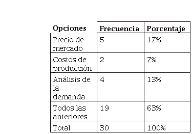 De acuerdo a la encuesta realizada, 5 mencionaron que la variable que utilizan para determinar el precio es el precio de mercado lo que representa el 17% del total de la población, mientras que 2 de ellos respondieron que son los costos de producción, lo que equivale al 7%, por otra parte 4 señalaron que mediante el análisis de la demanda lo que refleja un 13%, finalmente 19 acotaron que son todas las anteriores, reflejando un 63%.