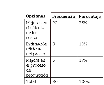 De acuerdo a la encuesta realizada, 22 mencionaron que el diseño de un manual de procedimientos les beneficiaría en el cálculo de los costos, lo que representa el 73% del total de la población, mientras que 3 de ellos respondieron que los beneficiaria en la estimación eficiente del precio, lo que equivale al 10%; y 5 de ellos mencionaron que los beneficia en mejorar el proceso de producción, lo que representa el 17%. La ventaja primordial que brinda un manual de procedimientos es que permite mejorar el cálculo de los costos, puesto que al tener una organización de los procedimientos genera mayor facilidad en la optimización y adquisición de los materiales.