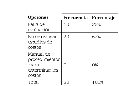 De acuerdo a la encuesta realizada, 10 mencionaron que el factor inciden generalmente en que no mantengan los costos de producción con las otras dulcerías es el no realizar estudios de costos, lo que representa el 67% del total de la población, mientras que 10 de ellos respondieron que el factor que más inciden es la falta de evaluación, lo que equivale al 33%.