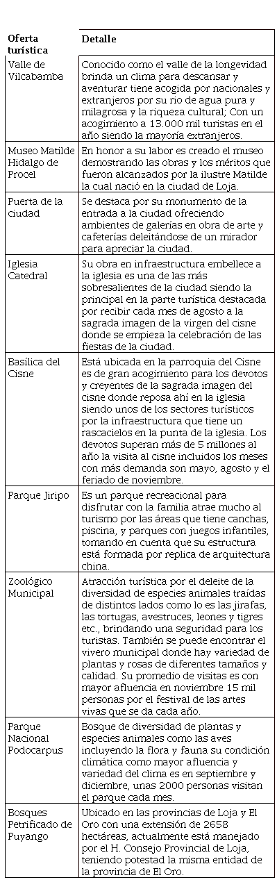 En la tabla 2 se puede apreciar de forma clara los principales destinos de la provincia de Loja, que la hacen única en el mundo y que han permitido que exista un flujo de turistas aceptables y que año tras año se vaya fortaleciendo la actividad turística, lo que incide directamente en que los negocios de las ciudades donde se desarrolla puedan ver incrementadas sus ventas de forma significativa, dinamizando las economías locales y por ende nacionales.