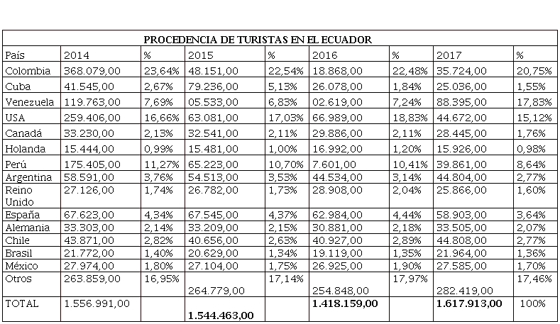 Como se puede apreciar, la mayor cantidad de turistas que llegan a Ecuador durante los últimos años son de Colombia, según la referencia al año 2017, donde el país cafetero representa el 20,75% del total de visitantes, debido a la cercanía que se tiene y por el comercio existente desde hace muchos años atrás; Venezuela representa el 17,83% y es un porcentaje alto que no se daba en periodos anteriores, pero se ha fortalecido en relación a la crisis económica que viven; en el tercer lugar esta los Estados Unidos de Norte América con el 15,12% debido a los atractivos turísticos de fama mundial, hay que tomar en consideración a Perú que por su cercanía se convierte en unos de los países de mayor visita a Loja.
