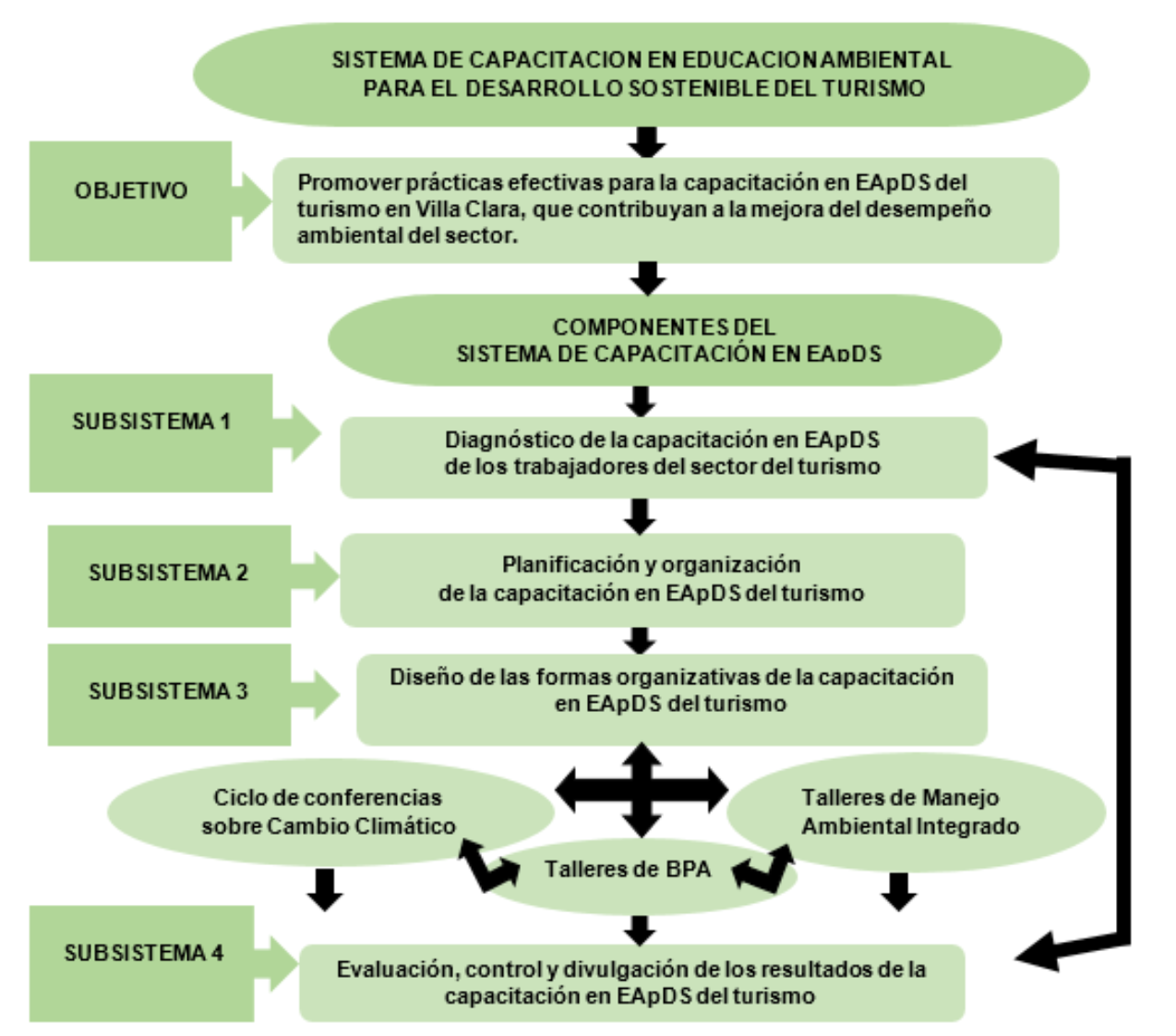 La aplicación de los fundamentos teóricos asumidos en el proceso investigativo sustentan la estructuración del Sistema de Capacitación en EApDS del turismo, comprometido con las metas trazadas en la Estrategia Ambiental Nacional y la Estrategia Ambiental del Mintur en Villa Clara 2017-2020, en sinergia con los Objetivos de Desarrollo Sostenible, el Programa de Desarrollo del país hasta el 2030 y los presupuestos de la Tarea Vida, como Plan de Enfrentamiento al Cambio Climático. El Sistema diseñado está compuesto por cuatro subsistemas que se complementan en estrecha sinergia, los que integran la gestión de la capacitación en EApDS del turismo en Villa Clara: Diagnóstico de la capacitación en EApDS de los trabajadores del turismo, Planificación y organización de la capacitación en EApDS, Diseño de las formas organizativas de la capacitación en EApDS y Evaluación, control y divulgación de los resultados de la capacitación en EApDS. Se realiza la valoración del Sistema diseñado mediante el empleo del criterio de usuarios, representados por el claustro del CCT. La aplicación de un instrumento con indicadores seleccionados al efecto y el procesamiento estadístico de sus resultados, demuestra que la herramienta estructurada obtiene criterios óptimos en cuanto a su contextualización y continuidad, carácter integrador y concepción holística y sistémica, racionalidad y aplicabilidad, que expresan su validez para ser implementado en el sector del turismo en Villa Clara. Por el alcance significativo del Sistema de Capacitación en EApDS del turismo, se realiza su evaluación tomando en consideración los importantes resultados por él aportado y que es posible constatar en la cotidianidad de la marcha del proceso de capacitación en EApDS. El aporte de alternativas para el diseño objetivo de los DNC; el diseño de formas organizativas optimizadas a partir de la incorporación de las lecciones de aprendizaje aportadas por la sistematización, en estrecha interrelación de niveles, dimensiones y lógica; el diseño de instrumentos, materiales de apoyo y herramientas novedosas que facilitan su implementación y el contar con el Aval del CITMA en Villa Clara, permiten afirmar que su diseño constituye un acierto científico en la batalla por la EApDS.