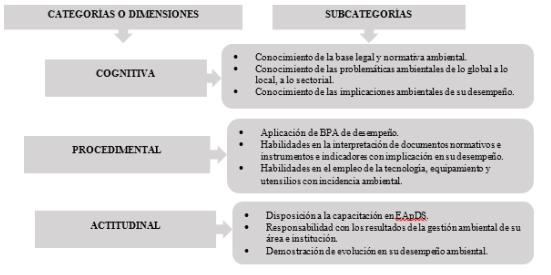 Para la elaboración de los DNC se debe considerar el sistema de categorías y subcategorías estructurado como hallazgo del proceso investigativo (Figura 2), y que consta de tres categorías: Cognitiva: expresada en los conocimientos generales asociados a la EApDS y a la gestión ambiental. Procedimental: expresada en las habilidades de incorporación de la EApDS a su desempeño. Actitudinal: expresada en el desarrollo personal, asociado a las cualidades y actitudes ambientales de su desempeño cotidiano.