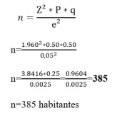 Para la obtención de la muestra, en las zonas vulnerables pertenecientes Santo Domingo, se utilizó un muestreo probabilístico aleatorio simple infinito con un nivel de confianza de 95% y un factor probabilístico de 〖1,960〖^2, el 5%, de error de estimación al cuadrado, con una probabilidad de ocurrencia del 50% y con una probabilidad de no ocurrencia del 50%, de lo que se obtuvo una muestra de 385 personas.