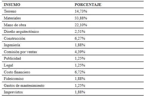 Finalmente, la estructura de costos propuesta en esta investigación tiene como fuente la Defensoría del Pueblo del Ecuador en un informe sobre el “Derecho a la vivienda”, donde se pone en evidencia la división en términos porcentuales del costo por metro cuadrado de una construcción, donde los principales rubros son: terreno, materiales y mano de obra, sin embargo, mencionan que los costos de una construcción pueden variar entre ciudades debido a las ordenanzas municipales ya que existe regularmente una actualización de catastros, regulaciones de seguridad en materia de bomberos entre otros cambios que pueden generar el alza en los costos por m2, para las ciudades donde es más costoso producir una vivienda como Quito y Guayaquil se ha visto un incremento del 87,5% en los costos a partir del 2008. Sin embargo, en esta investigación se propuso investigar el impacto que tendría la producción local de perfiles de aluminio en el sector de la construcción basado en datos de la Cámara de Construcción de Guayaquil e información de Arquitectos y especialistas de la construcción de Santo Domingo, por lo tanto, los resultados obtenidos pueden generalizarse por lo que se debe tener cuenta que el análisis de impacto se basó en la estructura general de una construcción en el Ecuador donde los materiales ocupan el 33,88% dentro de los cuales se encuentran los perfiles de aluminio.