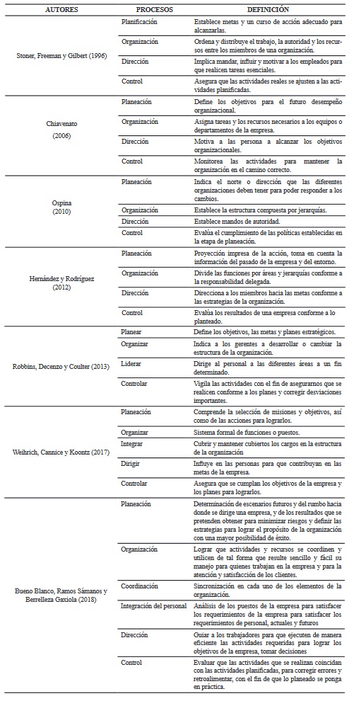Diversos autores han escrito sobre los procesos que conforman la gestión administrativa. Como se observa en el siguiente cuadro, durante más de 20 años no es mucha la diferencia entre ellos, de hecho, de los autores que se presentan, se incorpora alguna diferencia en la denominación de los procesos administrativos en 2013 y otros en 2017 y 2018.