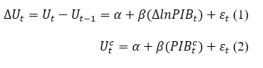 La segunda especificación relaciona los componentes cíclicos de las variables. Por un lado, U_t^c recoge la diferencia entre la tasa de desempleo observada y la tasa de desempleo de largo plazo, U_t-U_t^*. Por otro parte, 〖PIB〖_t^c mide el componente cíclico de la producción, la diferencia entre la producción efectiva u observada y el producto potencial, es decir, 〖PIB〖_t-〖PIB〖_t^* (en logaritmo). Es decir, los términos de ambos lados indican la diferencia entre los valores observados y