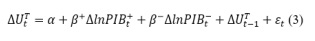 A pesar del poder predictivo que el enfoque original de Okun ha arrojado a lo largo del tiempo y en una amplia variedad de experiencias y países, no permiten considerar la posibilidad de replicar los patrones recientemente mostrados por el desempleo en Ecuador, donde los períodos de crecimiento parecen no estar fuertemente correlacionados con una significativa disminución del desempleo, mientras que en los períodos donde el PIB cae entonces la tasa de desempleo si se eleva considerablemente. Sobre todo, el modelo de primeras diferencias de la ecuación (1) no considera la perspectiva de una relación asimétrica entre las variables, cuestión que la literatura más reciente ha puesto de relieve. Para brindar respuesta a ello, se transforma la ecuación de primeras diferencias del siguiente modo, siguiendo la propuesta clásica de Schorderet (2001), que es un estándar en la literatura. El modelo de primeras diferencias está dado por la siguiente ecuación: