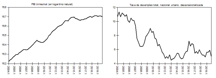 Figura 1. PIB real y desempleo en Ecuador, período 2004:1-2019:4
