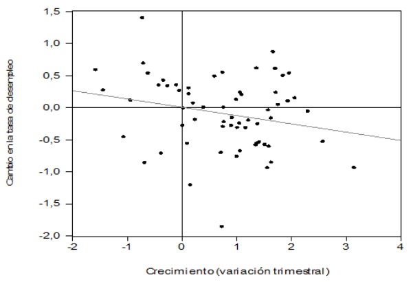 Figura 2. Relación entre variación del PIB y cambio en la tasa de desempleo