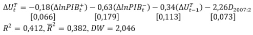 Donde los errores estándar de cada coeficiente estimado se muestran debajo, entre corchetes. Los resultados del estimador MCO de la ecuación (3) confirman la relación inversa entre crecimiento y desempleo en el período. Adicionalmente, el enfoque empleado para comprobar efectos asimétricos en la ecuación de primeras diferencias de la ley de Okun a partir de series de tiempo arroja resultados cónsonos con los esperados y en línea con la literatura. Es decir, los efectos del crecimiento del PIB sobre el desempleo son diferentes en magnitud, aunque ambos estadísticamente significativos al 1%. La regresión de la especificación asimétrica arroja que el coeficiente Okun para la tasa de crecimiento es negativa es igual a -0,63, mientras que el coeficiente asociado al crecimiento positivo en el periodo es -0,18. Esto significa que la tasa de desempleo sufre un mayor efecto en períodos donde el PIB presenta una variación o tasas de crecimiento negativa. Ante una caída porcentual del PIB, respecto al nivel del período previo, es de esperar un aumento en la tasa de desempleo equivalente a 0,63 puntos porcentuales. Durante una recesión típica, cuando el PIB disminuye porcentualmente (presenta tasa negativa de crecimiento), la tasa de desempleo aumenta respecto al nivel previo. Por el contrario, en una expansión de la economía ecuatoriana, con tasas positivas de crecimiento, la tasa de desempleo apenas disminuye 0,18 puntos porcentuales. En este caso, los resultados sugieren la preponderancia de efectos asimétricos en la relación estudiada.
