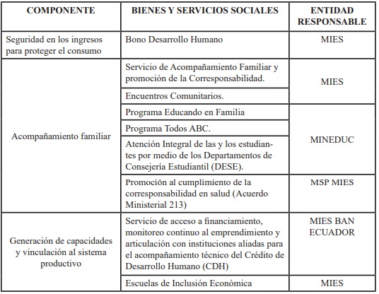 En la tabla N.° 2 están representados los productos y servicios sociales que el Ecuador ha ejecutado para erradicar la pobreza y dar cumplimiento al objetivo 1 de los Objetivos de Desarrollo Sostenible: Erradicar la pobreza, además de cuáles son los componentes de cada uno de estos programas de servicio social y las entidades reguladoras de cada uno de estos.
