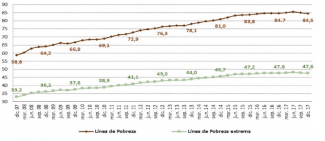 En el gráfico 1 podemos observar la evolución de la pobreza en dólares comprendido en el periodo de diciembre del 2007 hasta diciembre del 2017, la pobreza extrema a nivel nacional ha disminuido al igual que la línea de pobreza, es importante mencionar que la pobreza es un fenómeno medido multidimensionalmente. No obstante, resulta imprescindible manifestar que, dentro de estos 10 años de estudios representados en esta gráfica, el Ecuador sufrió un desastre natural como lo fue el terremoto en abril del 2016, a lo cual se le atribuye como una de las causas por lo que solo bajo muy poco los indicadores de pobreza pese a la implementación de los diferentes programas de servicios sociales.