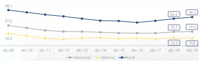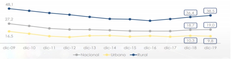 En el gráfico 3 observamos los indicadores a nivel nacional de la pobreza en el sector urbano y en el sector rural en el periodo comprendido desde diciembre del 2009 hasta diciembre del 2019, que al igual que los otros indicadores de la pobreza se ha disminuido levemente.