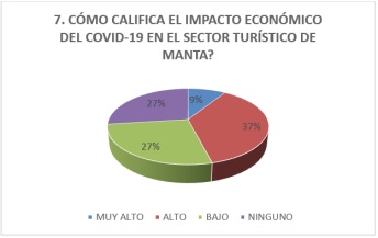Al analizar el impacto económico que ha generado el Covid-19 en el sector turístico de Manta, se encontró que 4 de cada 10 hoteles encuestados manifestaron que el sector turístico atraviesa una crisis económica derivada de la pandemia, lo que directamente afecta la economía de las empresas hoteleras de la ciudad. No obstante, existen hoteles que catalogan este efecto sobre la economía hotelera como baja o nula, por cuanto sus planes de acción generaron oportunidades que les permitieron mitigar la crisis económica.