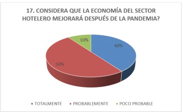 Finalmente, los resultados demostraron que existe una positiva y mayoritaria percepción en la empresas hoteleras respecto a la reactivación económica del sector una vez finalizada la pandemia, pues se contempla el hecho de que se generará un aumento del turismo a nivel general, y por tanto el incremento en la demanda de servicios de hospedaje. Sin embargo, los encuestados desconocen el momento en que esto suceda, pues las previsiones sanitarias no son exactas y dependen de la disminución del riesgo de contagio, y del control que se pueda lograr sobre la pandemia. Mientras tanto, deberán continuar generando estrategias para mantenerse hasta que de a poco la economía de este sector mejore.
