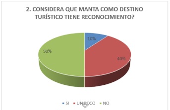 Los resultados muestran, que 5 de cada 10 hoteles de Manta creen que esta ciudad como destino turístico aún no posee el reconocimiento como uno de los lugares de mayor elección por parte de los viajeros. No obstante 4 de 10 hoteles, manifestaron que aunque existen falencias en las estrategias implementadas por el sector para lograr captar la atención de los turistas, en cierta medida si la puede contemplar como una de las ciudades preferidas por ciertos viajeros nacionales y extranjeros que reconocen al puerto turístico como un lugar con excelente ubicación geográfica, atractivos naturales y clima favorable.