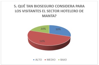 Al considerar las normas de bioseguridad implementadas por el sector hotelero de Manta, se determinó que la mitad de las empresas encuestadas catalogaron estas acciones como medianamente efectivas, pues a pesar de la importancia que representan para el turista, no todos los hoteles han priorizado estrategias de aplicación y de comunicación de las acciones tomadas para contrarrestar el riesgo de contagio, y así brindar seguridad al cliente. Solamente 3 de cada 10 hoteles indicaron que el sector hotelero es altamente bio-seguro para los visitantes, lo cual no genera una buena imagen como sector a nivel de ciudad.