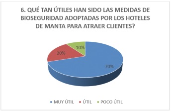 La gran mayoría de los hoteles que participaron en el estudio, esto es 7 de cada 10, consideran que las medidas y acciones de bioseguridad que se implementaron en las empresas hoteleras de Manta, han sido de gran utilidad para captar la atención del visitante, esto a pesar de los resultados de la figura 5 que muestran que en general los hoteles no se evidencian como bioseguros. Por otro lado, solo 1 hotel encuestado indicó que estas acciones adoptadas para minimizar los riesgos de contagio en las instalaciones de los hoteles eran de poca utilidad.