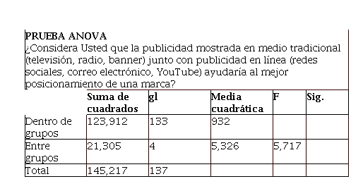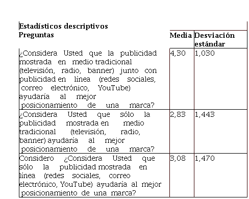 Mediante el estadístico descriptivo se logró el cumplimiento del objetivo considerando que la combinación de la publicidad mostrada en medio tradicional (televisión, radio, banner) y la publicidad en línea (redes sociales, correo electrónico, YouTube) ayudaría al mejor posicionamiento de una marca.