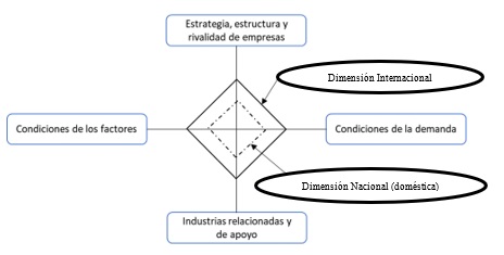 En la Figura 2 se muestra una sinergia entre los componentes propuestos inicialmente por Porter y las dimensiones nacional e internacional. Gracias a este modelo, la competitividad de un país está conceptuada como la capacidad de las industrias, para ejecutar acciones que integren valor adicionado a los bienes elaborados, en una empresa determinada y en una nación en específico, para evaluar este valor adicionado durante un tiempo considerable, para así, competir internacionalmente (Moon et al, 1998, p. 139).