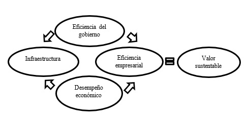 En la práctica, para la medición del índice de valor sustentable se considera 4 factores de competencia en donde se indagan con 300 criterios, cuyas sinergias determinan la competitividad de una nación (Solano, Espinoza & Uzcátegui, 2017). Los factores a tomar en cuenta son: la eficacia del gobierno, la infraestructura, la eficiencia empresarial y el desempeño económico. En la figura 3 se demuestra la relación entre los factores dando como resultado el valor sustentable.