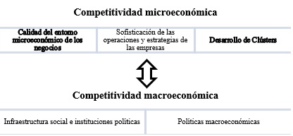 La competitividad macro evalúa la influencia de la competitividad de otras empresas, la política fiscal y la monetaria, la infraestructura y entidades legales (Solano et al, 2017), mientras que la micro toma en cuenta estrategias empresariales e intervención de clústers, como se demuestra en la Figura 4.