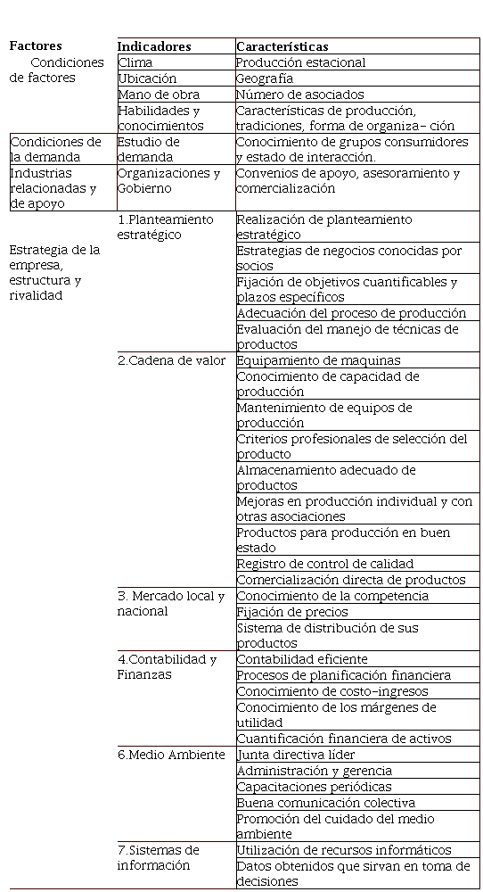 Finalmente, estos autores recomiendan que las técnicas de autoevaluación de la competiti- vidad deben ser complementadas por entrevistas a otros actores de la cadena productiva que logren dar una apreciación objetiva de la competitividad de estas organizaciones, complementada con la re- visión de datos históricos - documentales donde se corrobore las variables consideradas en la autoe- valuación. Considerando estos aspectos se aplicó instrumentos que contribuyen en el fortalecimiento de la evaluación de la competitividad.