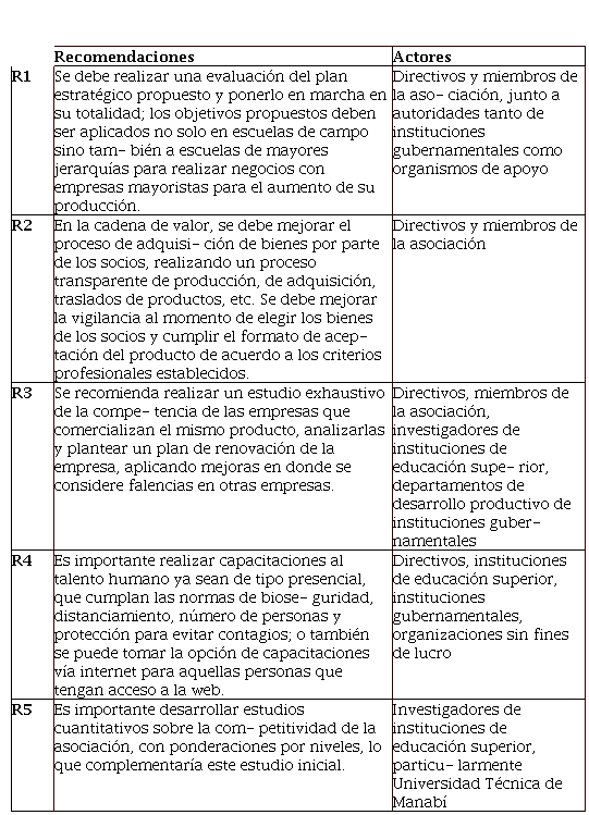 La Asociación de Cacao San Plácido del cantón Portoviejo es una organización con una sólida histo- ria que se ha mantenido a través de los años, a pesar de no haber planteado desde sus inicios un plan estratégico y que su existencia se ha mantenido a flote por motivos de adherencias corporativas. Se considera que ha tenido avances en cuanto a su competitividad, pero que aún se observan deficien- cias en el sector estratégico, en marketing y también en la competencia con otras organizaciones que comercializan el mismo producto. La ejecución del instrumento propuesto ha permitido identificar características de competitividad en la asociación, llegándose a constatar que, por ser una organi- zación del sector agrónomo, requiere de mayores acciones productivas que permitan crecer como empresa internacionalmente. Se hacen recomendaciones en función de las falencias encontradas en la Asociación, como se detalla de manera específica en el cuadro No. 3. Los autores reconocen los limitantes de este estudio, que se enfocó solo en el análisis cualitativo, por lo que sería importante la ampliación del mismo con técnicas cuantitativas de competitividad, ya que se podría aplicar medi- ciones por niveles para evaluar esta y otras asociaciones productivas, con el fin de lograr un mayor crecimiento empresarial.