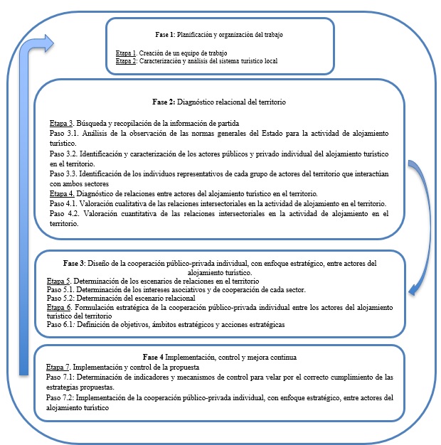 Fase 3: Diseño de la cooperación público-privada, con enfoque estratégico, entre actores del alojamiento turístico a escala local. Mediante dos etapas (5 y 6), en esta fase se determinan los escenarios relacionales de cada territorio y considerando los espacios de actuación en los mismos se realiza la formulación con enfoque estratégico de la cooperación público-privada individual entre actores del alojamiento turístico.