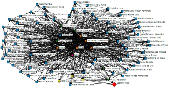 Por otra parte se puede observar la dispersión existente en la red de relaciones que funciona entre los actores turísticos de Trinidad evidenciada a partir de la presencia del Gobierno Local en la periferia de la misma cuando el lugar que debería ocupar es el de actor central y dirigir todo el proceso desde esta posición.