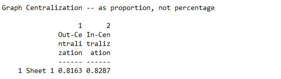 En cuanto a la densidad, los resultados muestran un valor de 0,181(18,1%), lo que implica que los vínculos que posee la red actualmente son solamente un quinto de los posibles que pudieran generarse, por lo que es relativamente baja. En esa misma salida también se puede observar el indica- dor del grado promedio que es de (14,867), esto se traduce como que el total de actores que compo- nen la red (83), establecen como promedio aproximadamente 15 vínculos con los demás actores de la misma. Relativo a la centralización, los resultados generados muestran que está más centralizada en grados de salida (0,8287) que de entrada (0,8163), pero se puede advertir que no existe diferencia significativa entre ambos; lo cual implica que en la red existen uno o más nodos que son dominantes tanto para los vínculos de salida como para los vínculos de entrada.