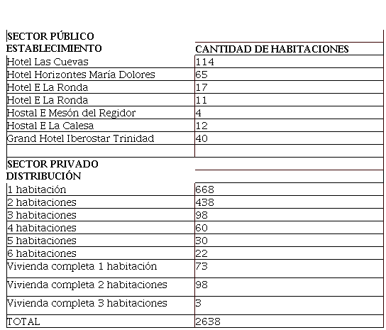 Los resultados obtenidos tras la aplicación de la etapa correspondiente a la identificación de los actores públicos y privado de alojamiento turístico en la ciudad (Tabla 1) muestran claramente como el número de habitaciones del sector privado supera en gran medida a las disponibles por el sector público, en una proporción entorno 1 a 10.
