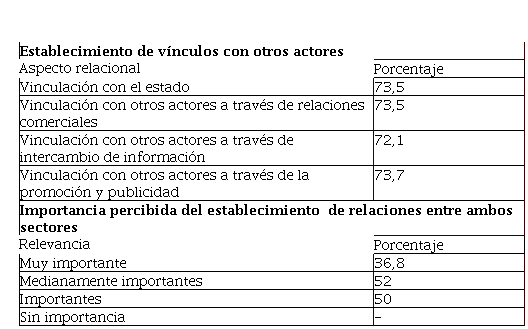 73,5% de los encuestados asegura tener vínculos de carácter comercial con otros actores que operan en la ciudad. , un 72,1% afirma que sostienen relaciones de intercambio de información y un 73,7% de promoción y publicidad; ninguno de los actores privados afirmó tener relaciones de suministro de materias primas, materiales y tecnologías con ningún otro actor.
