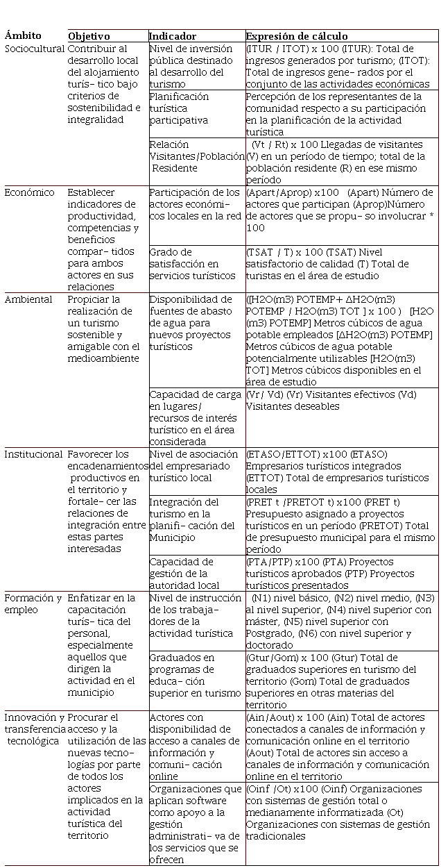 La propuesta quedó conformada como muestra la (Tabla 5) por 14 indicadores, divididos en seis ámbitos (ambiental, económico, sociocultural, institucional, formación y empleo e innovación y transferencia tecnológica), que en su conjunto abarcan de forma sistémica las posibilidades asociativas de los actores turísticos del territorio.