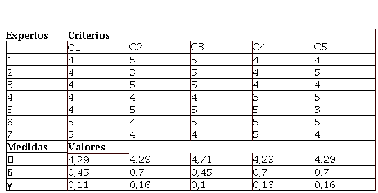 Los resultados obtenidos respecto al valor medio (Ẍ) de cada uno de los criterios muestran un comportamiento alto (mayor que 4) en la evaluación de los especialistas. Esto demuestra que existe correspondencia en el criterio de los especialistas y por tanto el sistema de indicadores es evaluado de positivo para ser aplicado al objeto de estudio.